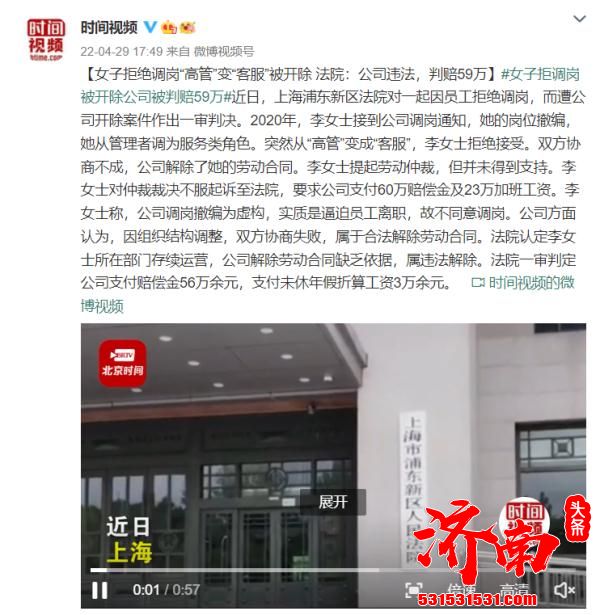 上海一员工拒绝调岗遭开除 公司违法 员工获赔59万