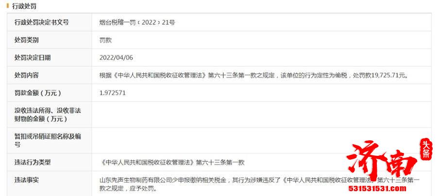 山东先声生物制药有限公司少申报税金涉嫌偷税被罚
