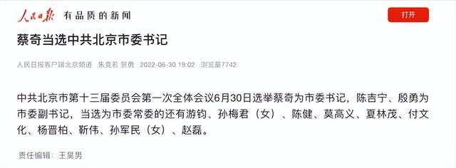 北京市召开第十三届委员会第一次全体会议蔡奇当选为北京市委书记