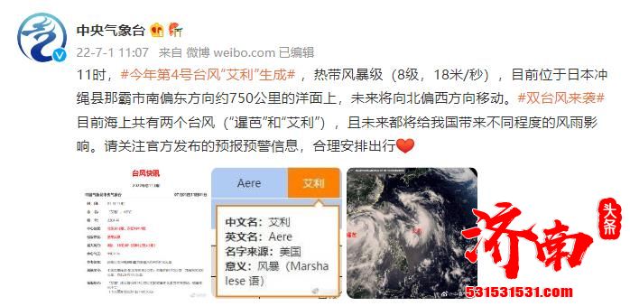 今年第4号热带风暴级台风“艾利”生成 将向北偏西方向移动