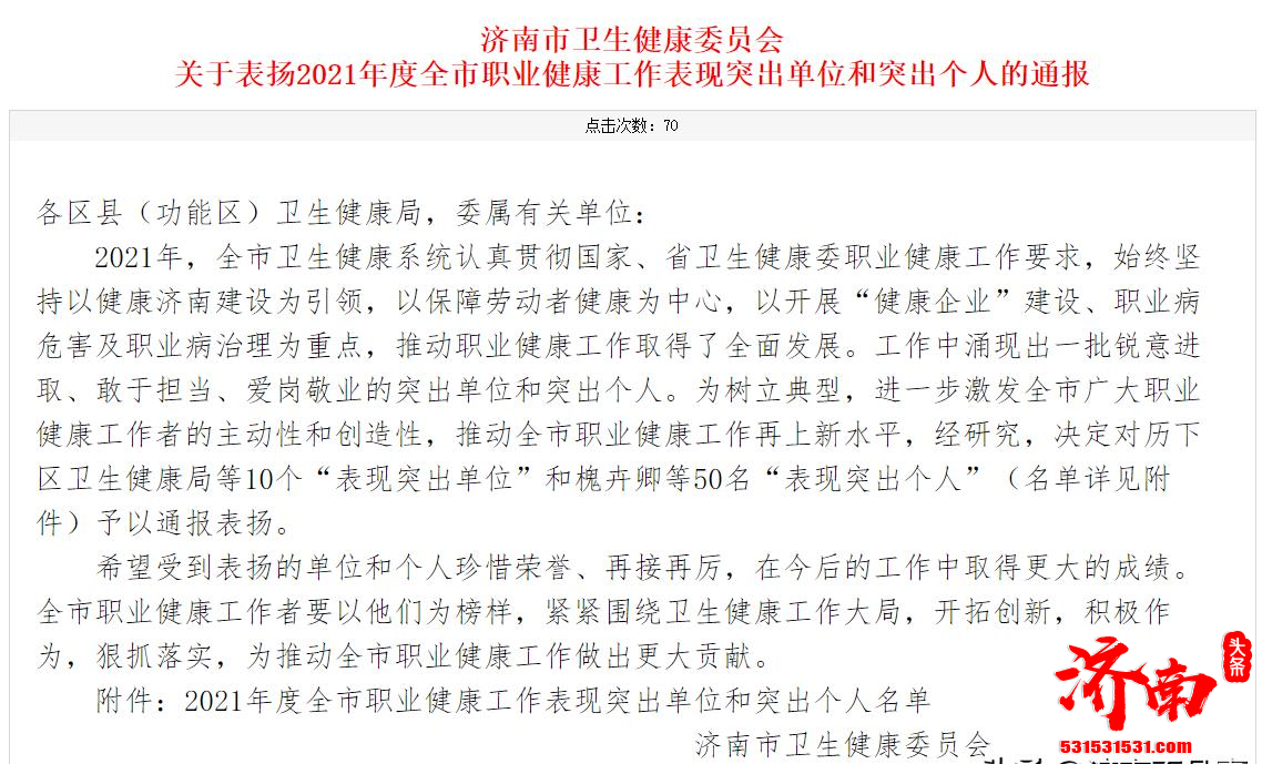 济南发布关于表扬2021年度全市职业健康工作表现突出单位和突出个人的通报