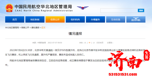 北京十渡景区坠毁飞机系北京华彬天星通航一架贝尔505型直升机 两名飞行员遇难