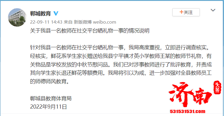 河南一名教师在社交平台晒礼物引争议 责成其退还鲜花等额费用