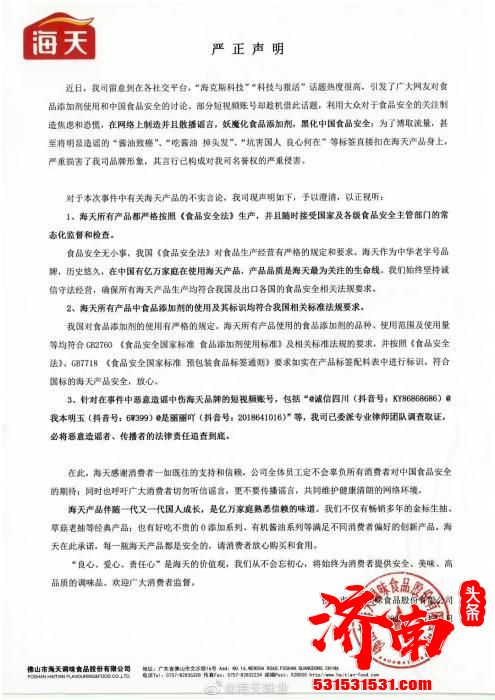 海天味业发布声明回应酱油添加剂争议 所有产品中食品添加剂符合国家标准