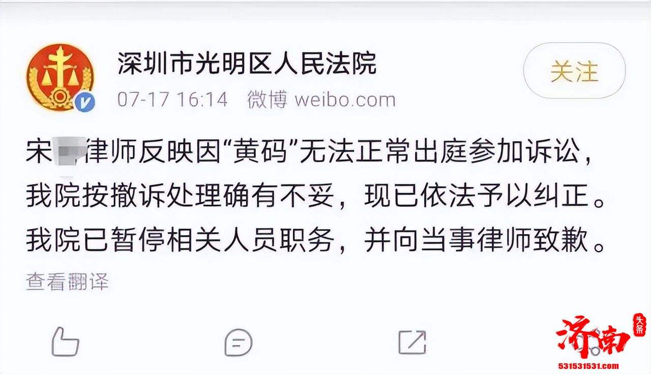 律师因疫情防控原因被赋黄码无法出庭 最后按撤诉处理 深圳市光明区人民法院发文回应