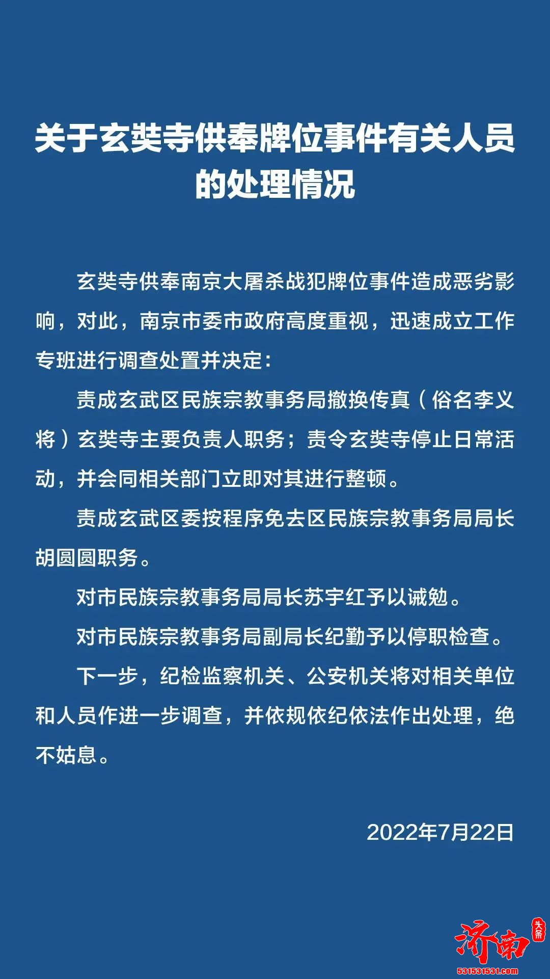 南京市委市政府发布玄奘寺供奉侵华日军战犯牌位事件调查处理情况的通报
