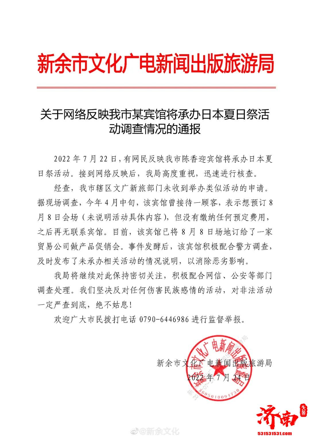 新余市陈香迎宾馆将承办日本夏日祭活动被通报调查